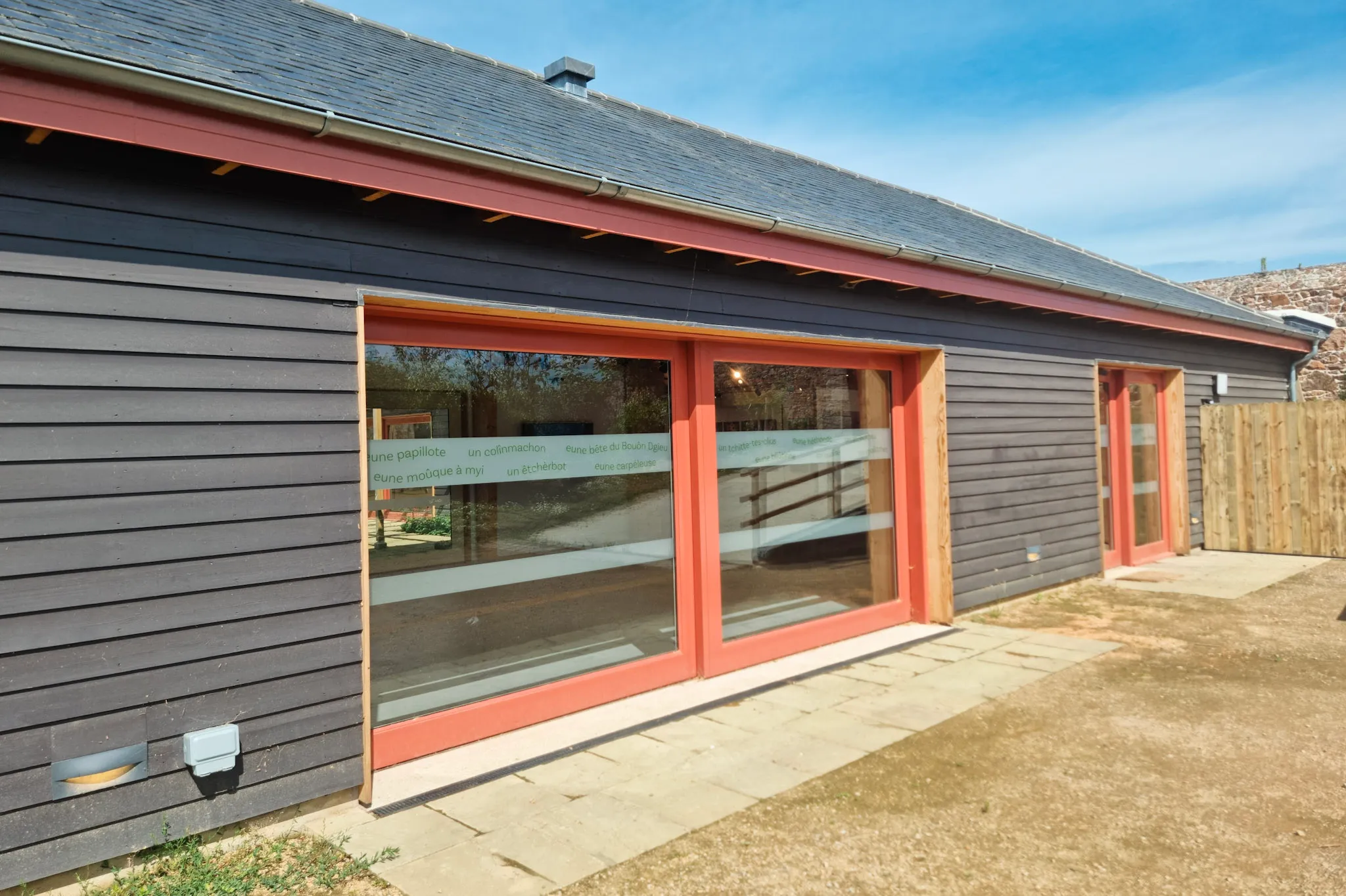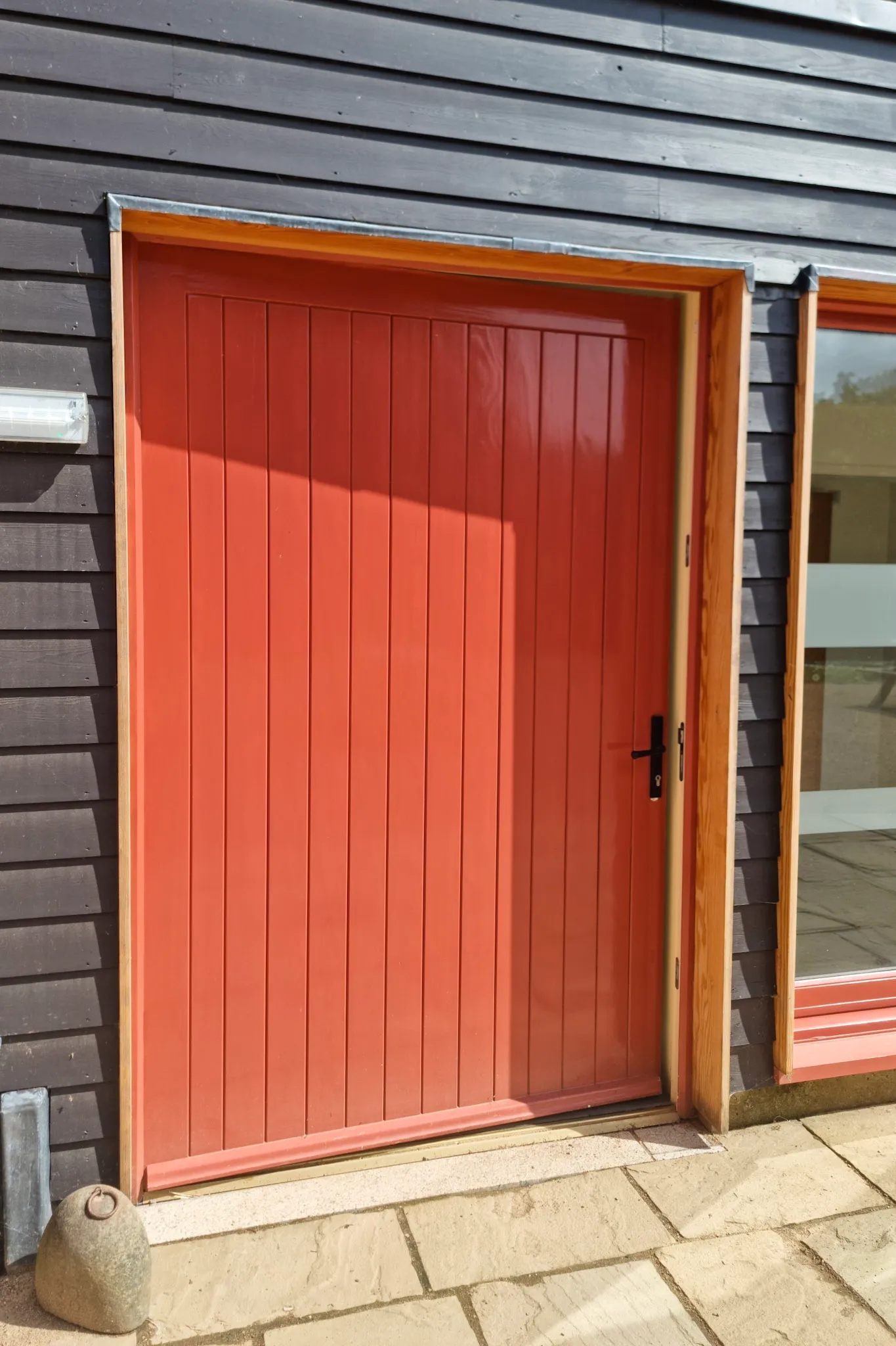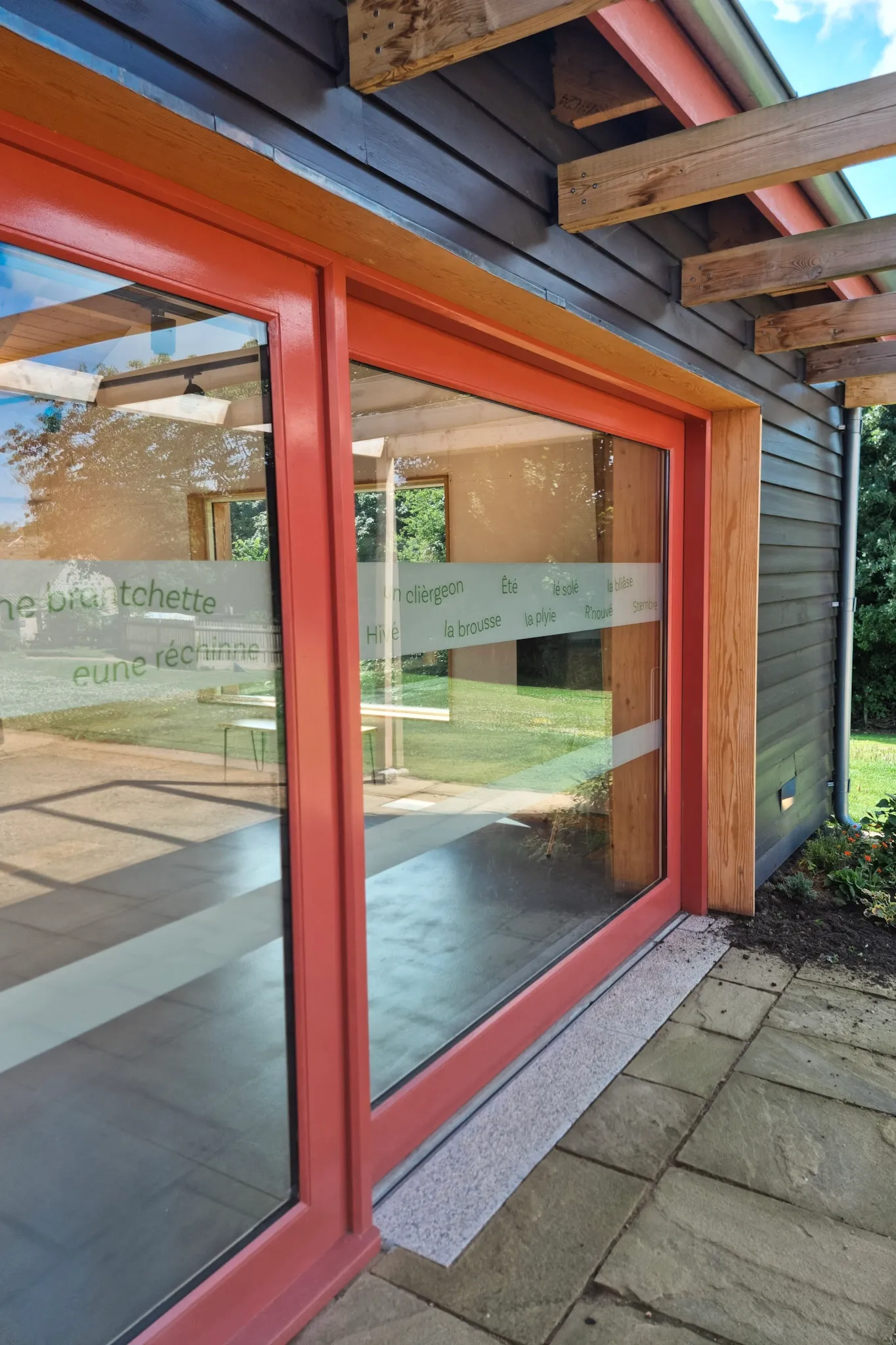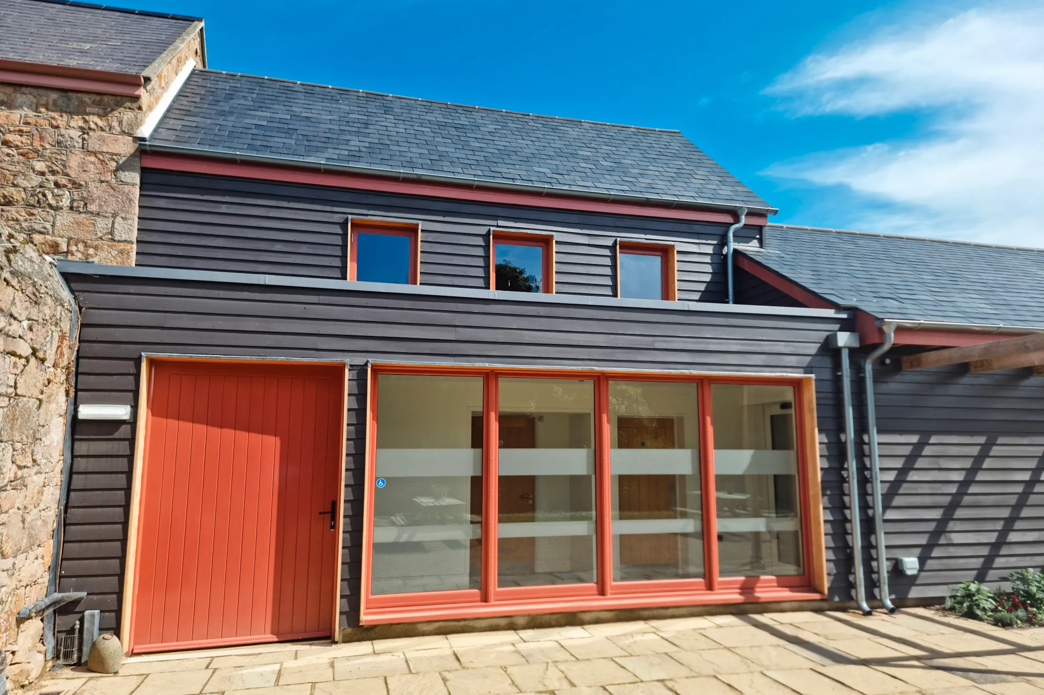 Unique coral sliding doors sets this modern barn conversion apart, and brings a striking contrast to the picturesque Hamptonne Country Life Museum in Jersey.