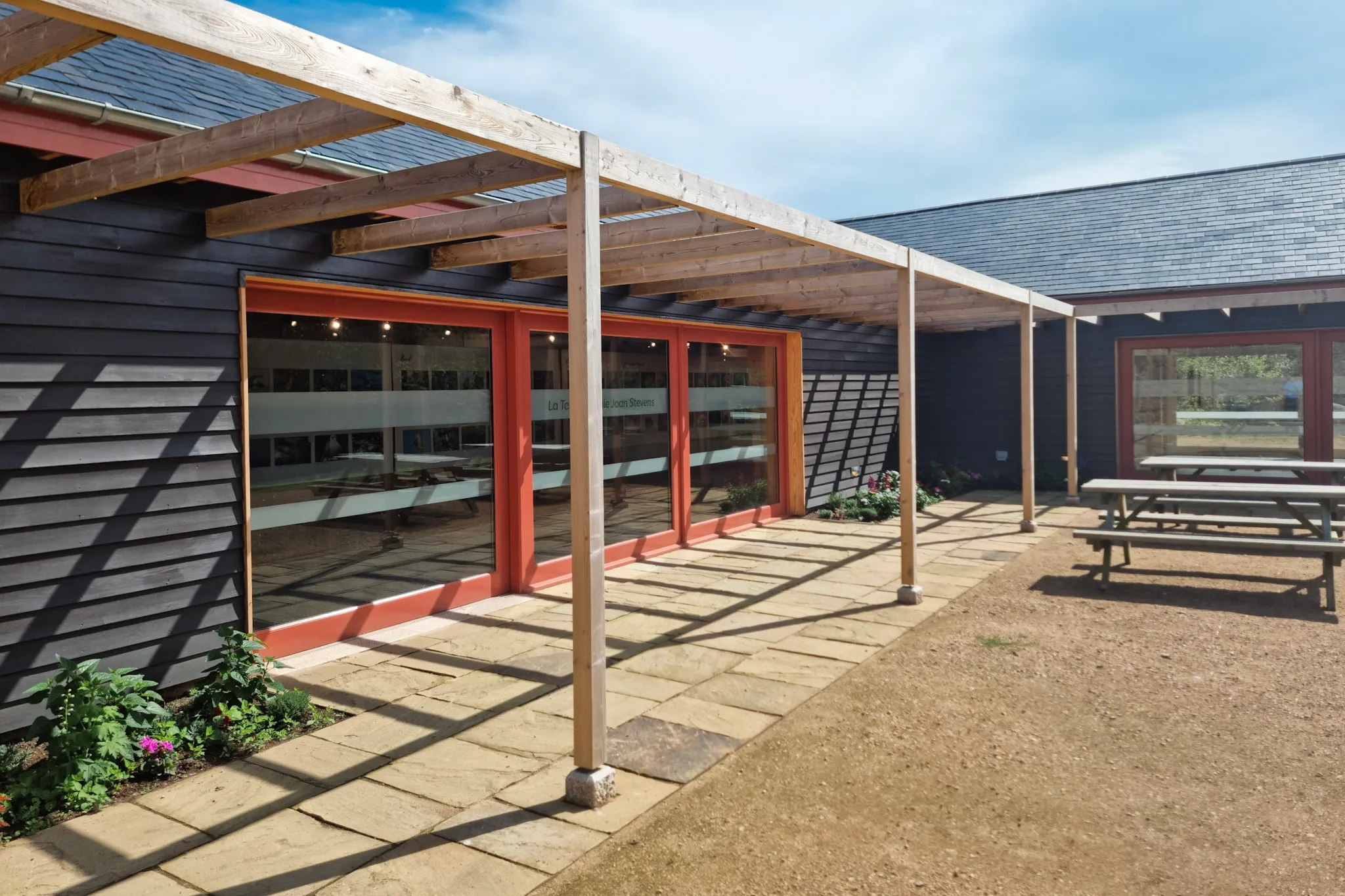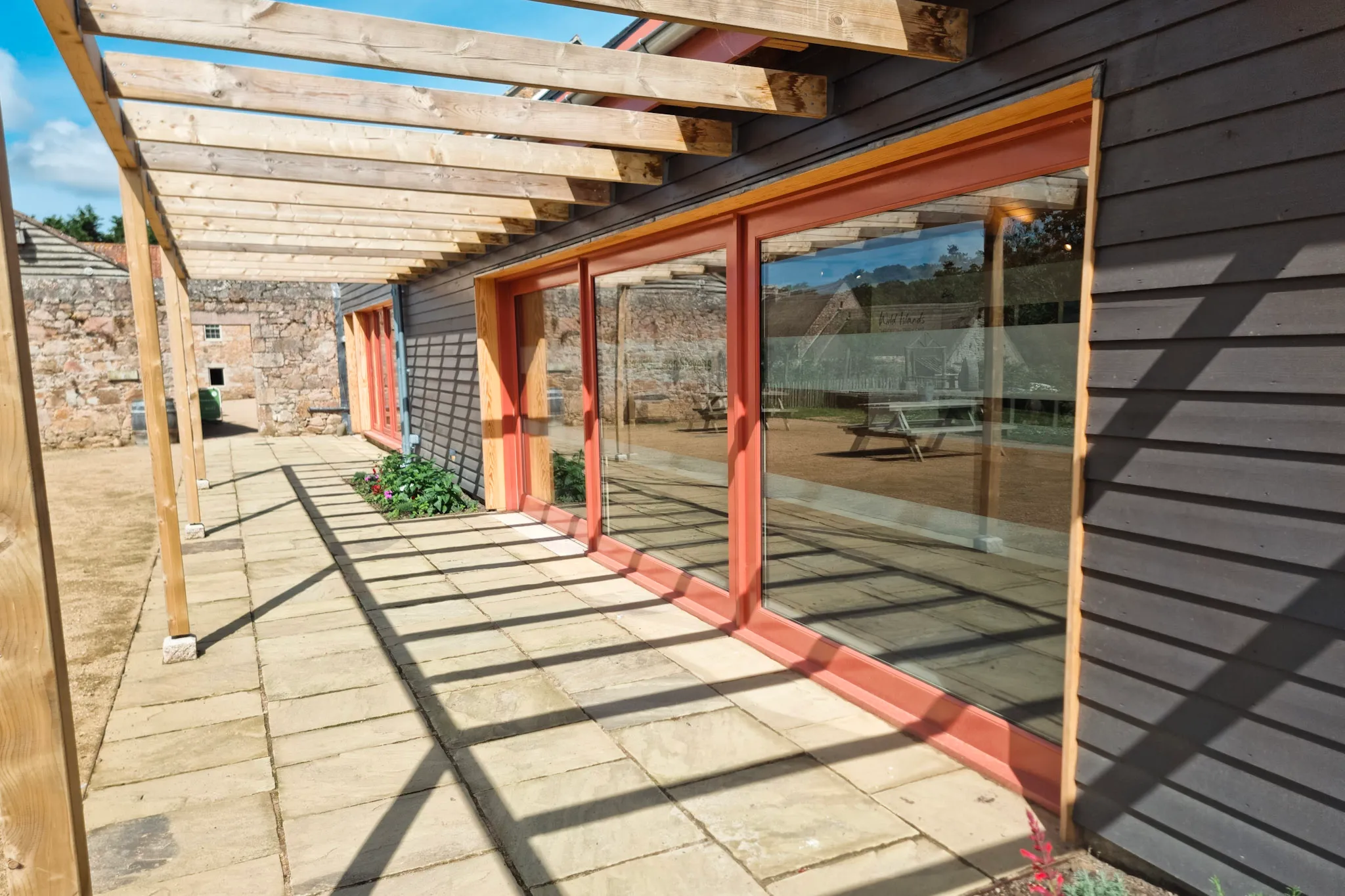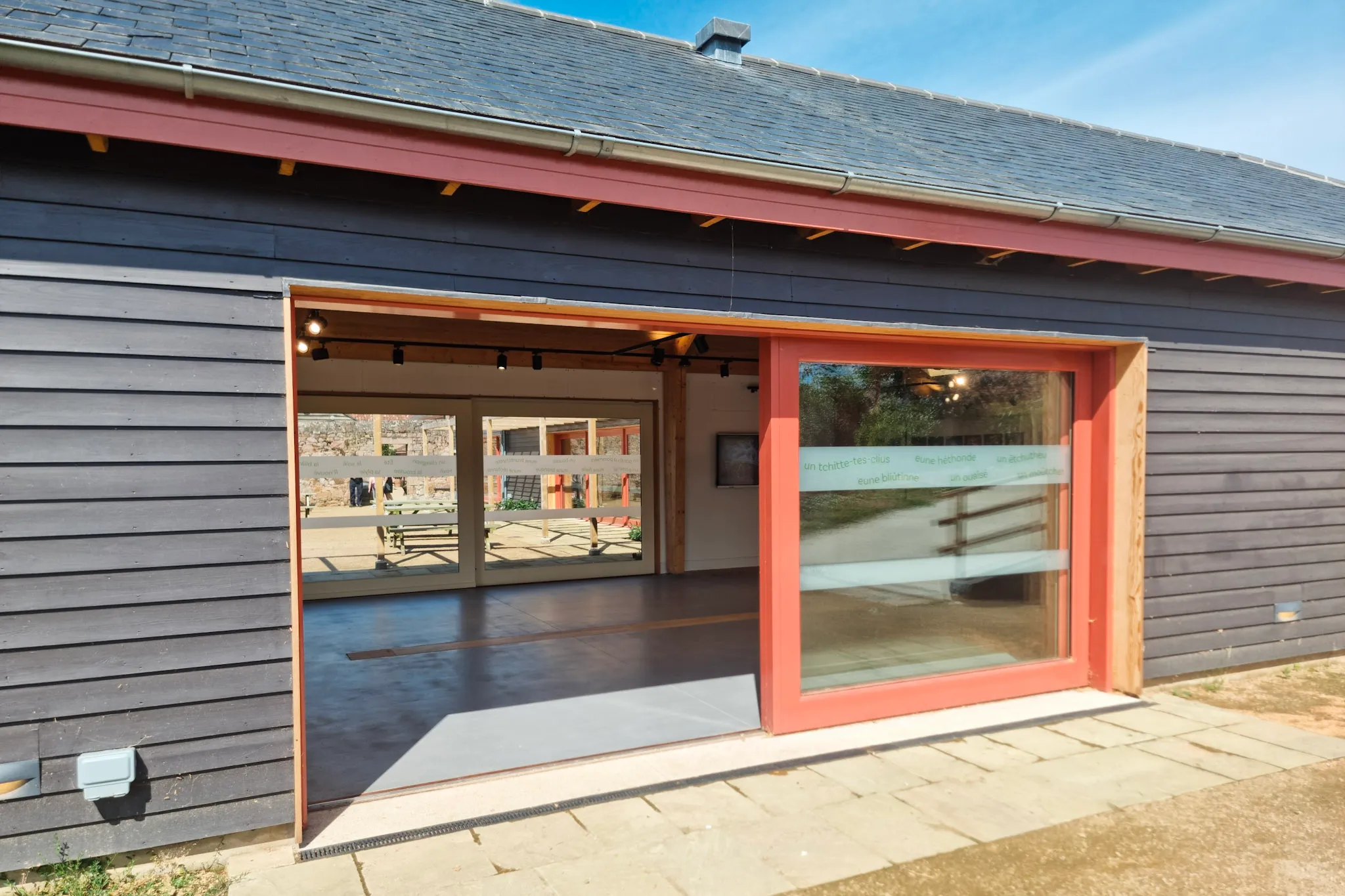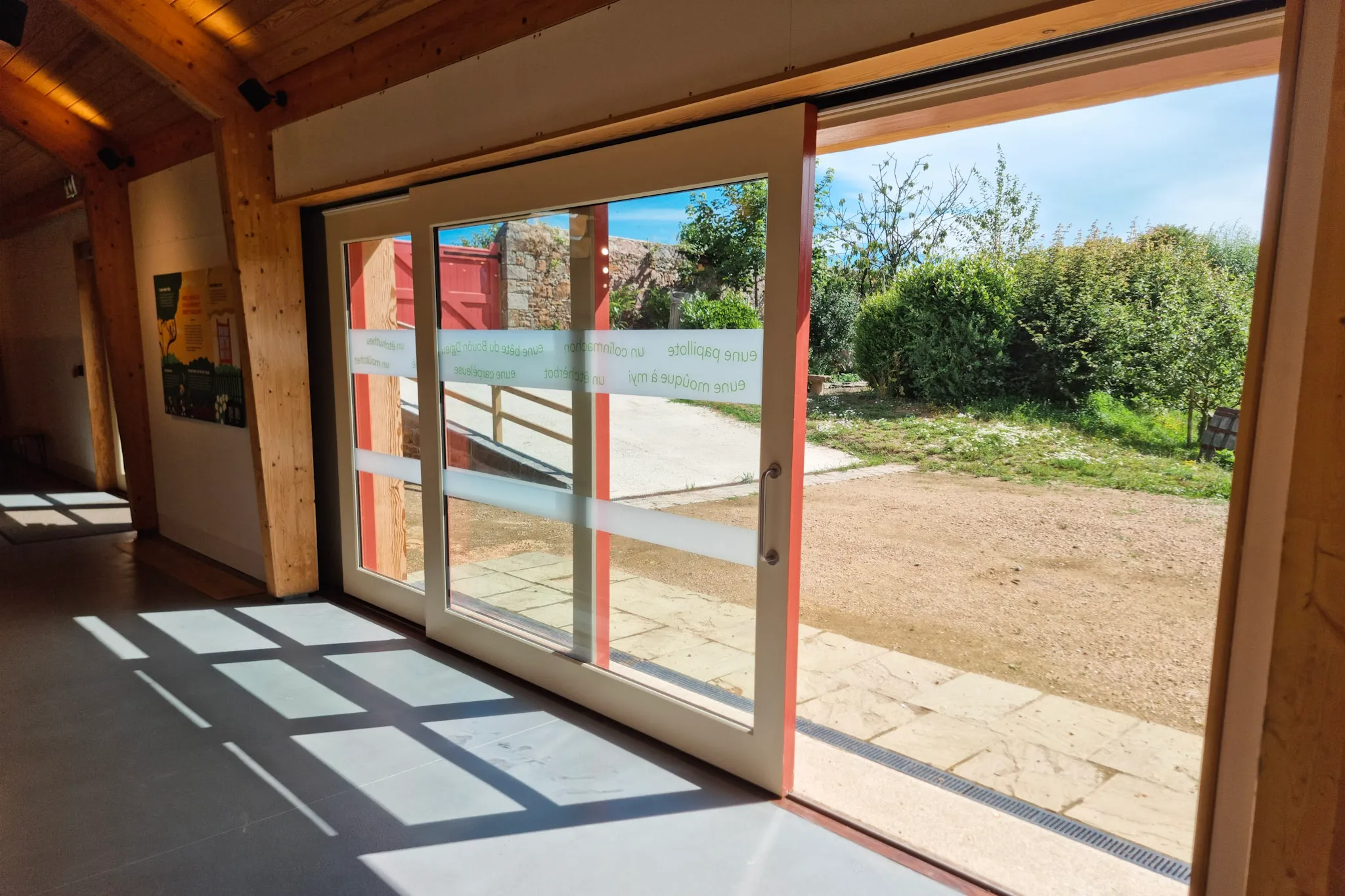 Unique coral sliding doors sets this modern barn conversion apart, and brings a striking contrast to the picturesque Hamptonne Country Life Museum in Jersey.